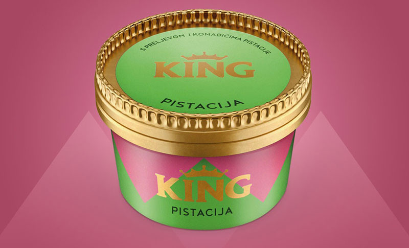 Nakon dugogodišnje konzumacije KING sladoleda isključivo na štapiću, u 2020-oj prvi put na tržište dolazi kao najkremastiji sladoledni desert u pakiranju čašice. Promjena formata i činjenica da je sladoled osim u retailu, namijenjen i prodaji u HORECA-i, iziskivao je uočljiv, zaigran i suvremen dizajn.
