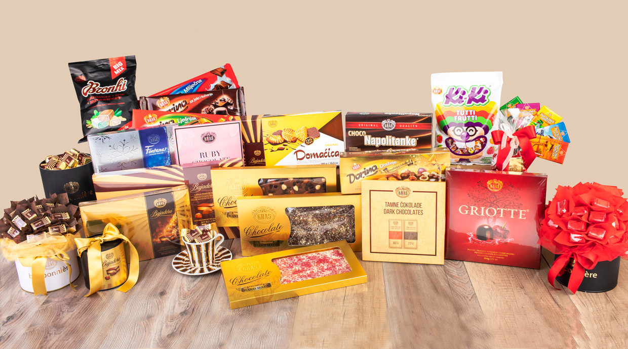 Na platformi Glovo mogu se naći Kraš hand-made čokolade, Kraš tamna čokolada, praline 1911., Bajadera, Griotte, Fontana, Novela, marcipan Maestro, bombonijere, ali i naši najpoznatiji brandovi poput Životinjskog carstva, Napolitanki, Domaćice te Kiki, Bronhi i žele bomboni, slatki pokloni te ukrasne kutije za poklone.