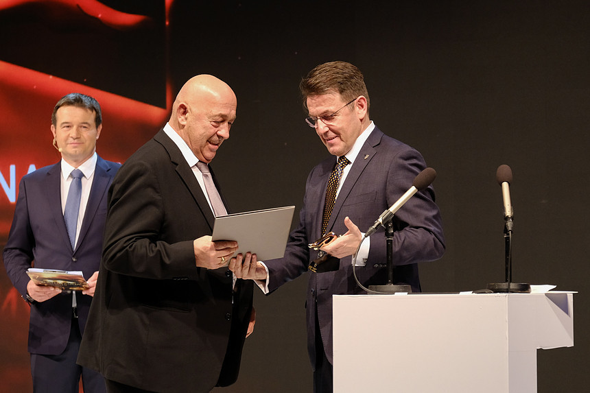 Ministar gospodarstva Darko Horvat uručio je Zlatnu kunu za najsupješniju banku Miljenu Živaljiću, predsjedniku Uprave Zagrebačke banke; Izvor: HGK.