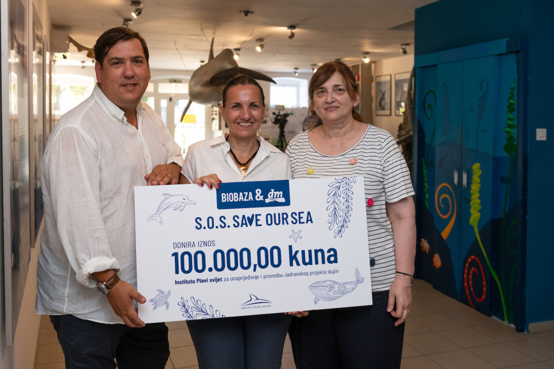 Institutu Plavi svijet je u Velom Lošinju predana donacija Biobaza prirodne kozmetike i dm-a u iznosu od stotinu tisuća kuna. Sredstva su prikupljana od lipnja u svim dm prodavaonicama prodajom limitirane kolekcije Biobaza S.O.S. Save our Sea prirodne kozmetike, posebno osmišljene za ovu društveno odgovornu aktivnost i pakirane u održivoj ambalaži. Cilj kampanje bio je podizanje svijesti o očuvanju okoliša, smanjenju korištenja plastike i mikroplastike koje utječu na okoliš, a ponajviše na morski svijet i životinje u Jadranu koje nerijetko stradavaju zbog plastičnog otpada u moru. Kupnjom svakog S.O.S. Save our Sea proizvoda, Biobaza i dm donirali su pet kuna za ovu hvalevrijednu aktivnost s ciljem unaprjeđenja i provedbe dugogodišnjeg Jadranskog projekta dupin.