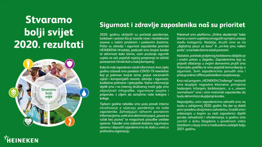 HEINEKEN Hrvatska objavio je svoje godišnje Izvješće o održivosti za izazovnu 2020. godinu. Usprkos globalnoj javnozdravstvenoj krizi, koja je nepovoljno utjecala na gotovo sve segmente gospodarstva, kompanija nastavlja s provedbom strategije održivog poslovanja Stvaramo bolji svijet.