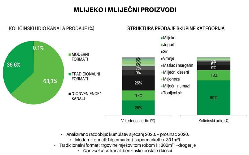Moderni formati, u koje ulaze hipermarketi (>2500m2) i supermarketi (301-2500m2), prodaju najviše mlijeka i mliječnih proizvoda, i to više od polovice ukupne količinske prodaje (63%). Manji udio, od 37% količinske prodaje, prolazi kroz trgovine mješovitom robom (<300m2), dok kroz convenience kanal, u koji pripadaju kiosci i trgovine na benzinskim postajama, odlazi samo 0,1% ukupne količinske prodaje cijele kategorije.