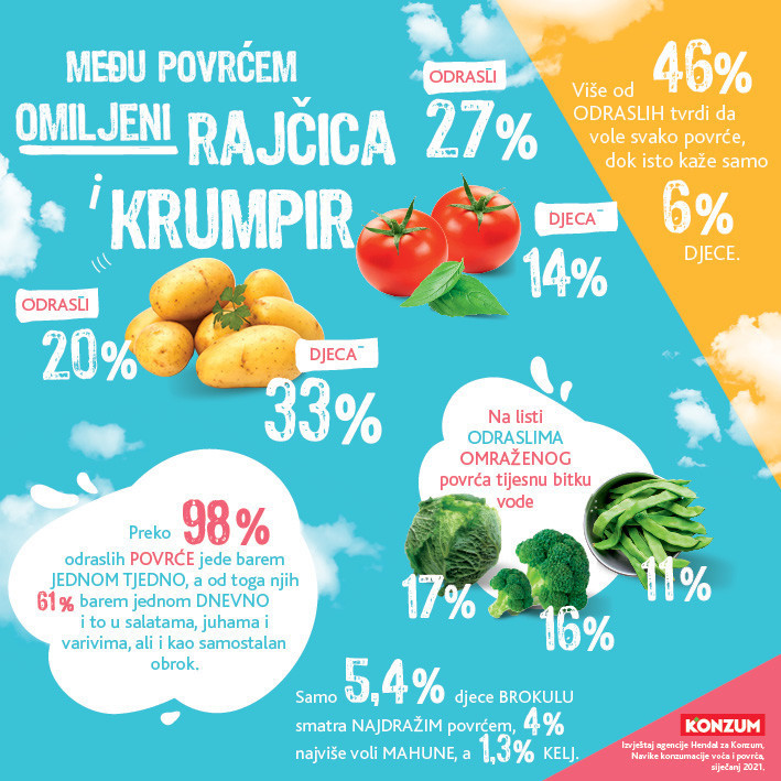 Istraživanje otkriva da na ljestvici omiljenog povrća kod odraslih vode rajčica (27 posto), krumpir (20 posto) i zelena salata (13 posto), dok je kod djece predvodnik krumpir (33 posto), a slijede ga mrkva (14 posto) i rajčica (14 posto). Na listi odraslima omraženog povrća tijesnu bitku vode kelj (17 posto) i brokula (16 posto), a približavaju im se i mahune (11 posto), dok pritom 5,4 posto djece brokulu smatra najdražim povrćem, 4 posto najviše voli mahune, a 1,3 posto kelj. Više od 46 posto odraslih tvrde da vole svako povrće, dok isto kaže samo 6 posto djece. Preko 98 posto odraslih povrće jede barem jednom tjedno, a od toga njih 61 posto barem jednom dnevno i to u salatama, juhama i varivima, ali i kao samostalan obrok u čemu prednjače Dalmatinci. Djeca povrće jedu najčešće jednom dnevno ili 2 do 3 puta tjedno.