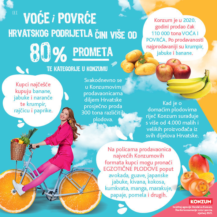 Konzum je u 2020. godini prodao čak 110.000 tona voća i povrća, od čega najviše banana, krumpira i jabuka. Svakodnevno se u Konzumovim prodavaonicama diljem Hrvatske prosječno proda 300 tona različitih plodova, a pritom kupci najčešće posežu za bananama, jabukama i narančama kad je riječ o voću, odnosno za krumpirom, rajčicama i paprikama kad kupuju povrće.