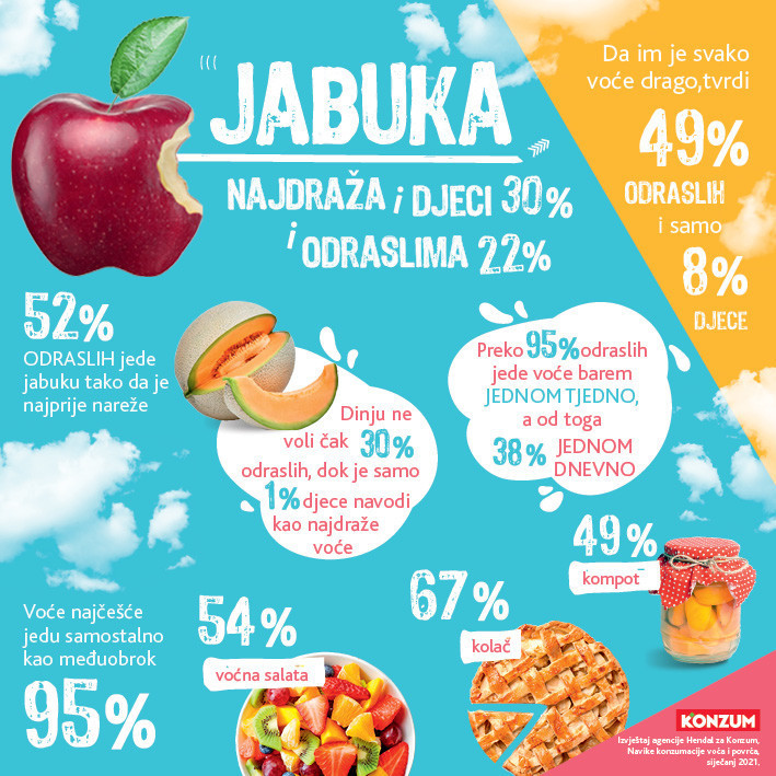 Istraživanje je otkrilo i puno zanimljivih činjenica o navikama konzumacije voća i povrća kod građana Hrvatske. Jabuka je tako najdraže voće i odraslima (22 posto) i djeci (30 posto), pri čemu je čak 52 posto odraslih jede tako da je najprije nareže. S druge strane, dinju ne voli čak 30 posto odraslih, dok je samo 1 posto djece navodi kao najdraže voće. Da im je svako voće drago, tvrdi 49 posto odraslih i samo 8 posto djece. Preko 95 posto odraslih jede voće barem jednom tjedno, a od toga 38 posto jednom dnevno te ga jede najčešće samostalno kao međuobrok (95 posto), u voćnoj salati (54 posto), kolaču (67 posto) ili kompotu (49 posto). Oni koji ga jedu rjeđe od jednom tjedno za to krive naviku – ne sjete se uzeti voće češće ili radije jedu nešto drugo kad osjete glad.