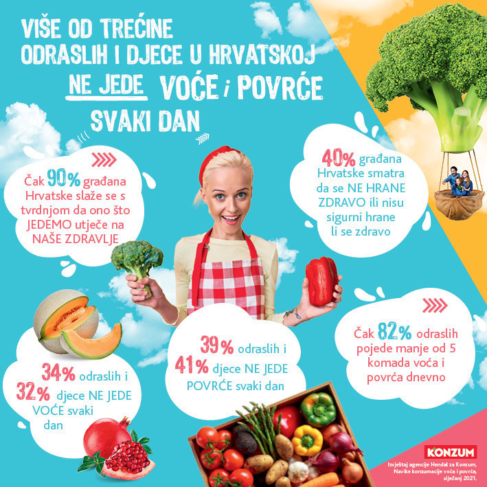 Iako se čak 90 posto građana Hrvatske slaže s tvrdnjom da ono što jedemo utječe na naše zdravlje, ipak 40 posto smatra da se ne hrane zdravo ili nisu sigurni hrane li se zdravo. Pokazuje to istraživanje o navikama konzumacije voća i povrća među građanima Hrvatske koje je u siječnju 2021. za Konzum provela agencija Hendal.