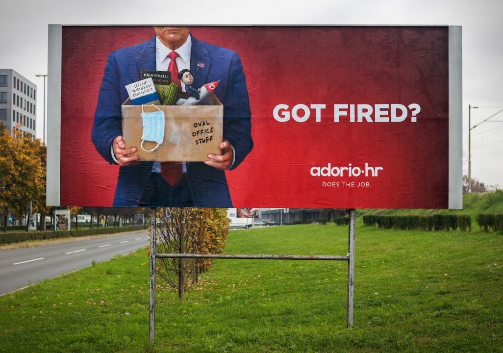 Platforma Adorio, u suradnji s kreativnom agencijom Spellcaster, pokrenula je provokativnu i duhovitu kampanju s likom predsjednika Trumpa koji sa kutijom svojih privatnih stvari napušta Bijelu Kuću uz poruku “Got Fired?” ili na hrvatskom - “Ostali ste bez posla?”.