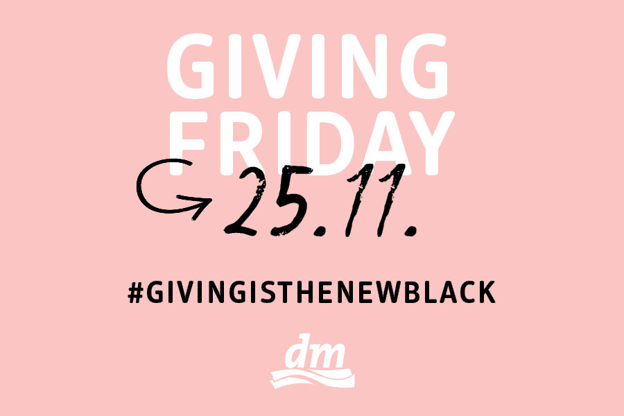 U petak, 25. studenog, dm obilježava Giving Friday, potpuno drukčiju verziju Crnog petka, povodom kojeg će donirati pet posto dnevnog prometa ostvarenog u 171 prodavaonici dm-a i u dm online shopu. Ovogodišnji Giving Friday posvećen je djeci i mladima bez odgovarajuće roditeljske skrbi o čijem odgoju, obrazovanju, zdravlju i ostalim potrebama brinu Centar za pružanje usluga u zajednici Klasje iz Osijeka i Centar za pružanje usluga u zajednici Lipik.