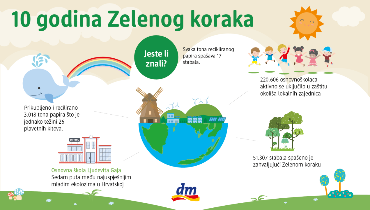 „Tijekom deset godina djeca diljem Hrvatske pokazuju nam da možemo napraviti velike stvari ako se udružimo i djelujemo zajedno. Ponosni smo na Zeleni korak i na sve mlade ekologe koji su do sada sudjelovali u njemu. Zato, uime dm-a, želim zahvaliti svim učenicima i djelatnicima škola što su doprinijeli zaštiti okoliša svoje lokalne zajednice te onima koji su nas i ove godine podsjetili da je svaki zeleni korak važan za održiviju budućnost“, izjavila je Gordana Picek, prokuristica i voditeljica resora Nabave i marketinga u dm-u.