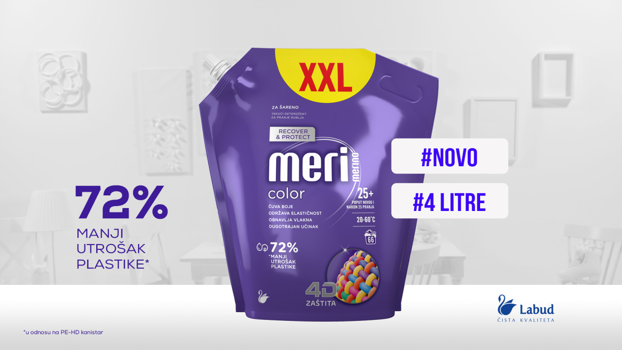 Novo inovativno pakiranje je efikasna zamjena za čvrstu plastiku, olakšava korištenje, a potrošači njegovim odabirom pridonose smanjivanju korištenja plastike i količina plastičnog otpada. Uvođenjem mekih vrećica s ventilom, kao zamjene za plastične PE-HD kanistere, utrošak električne energije u proizvodnji ambalaže smanjuje za oko 90 posto, te se smanjuje i CO² otisak. Ukupno će Labud s novim pakiranjem Meri Merina od 4L, generirati 72 posto manje plastike i plastičnog otpada što može iznositi oko 60 tona* godišnje, samo na jednom proizvodu.