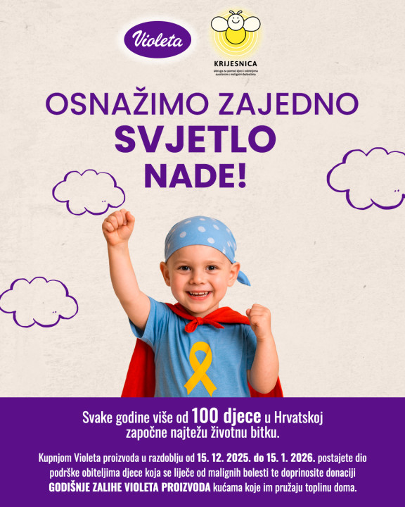 Ove godine to svjetlo postaje još snažnije - Violeta pokreće humanitarnu kampanju “Osnažimo zajedno svjetlo nade”, kako obiteljima koje privremeno žive u roditeljskim kućama pružili toplinu doma kroz donaciju godišnje zalihe proizvoda. A kupnjom Violeta proizvoda u razdoblju od 15. prosinca 2025. do 15. siječnja 2026. i Vi postajete dio podrške obiteljima djece koja se liječe od malignih bolesti.