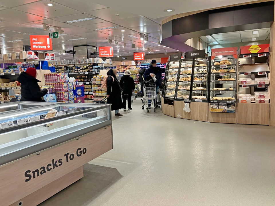 Jasna talna signalizacija vodi stranke skozi veleblagovnico do Lidla. Napis "Hier geht's zur Frische!" ("Tako do sveže hrane!") usmerja tok pešcev proti oddelku s hrano.