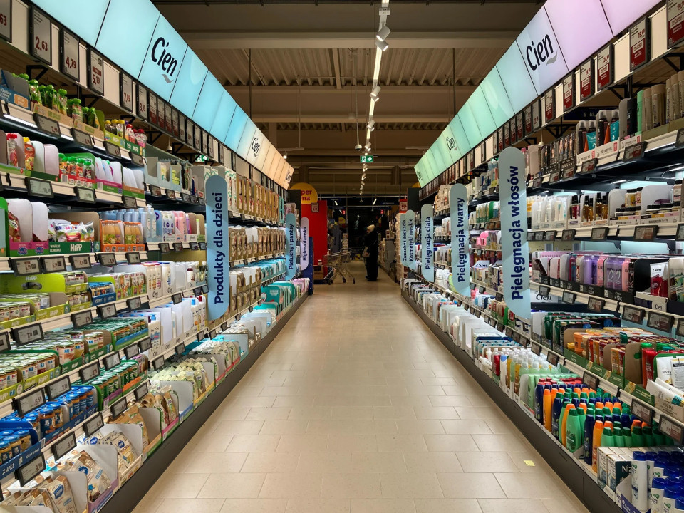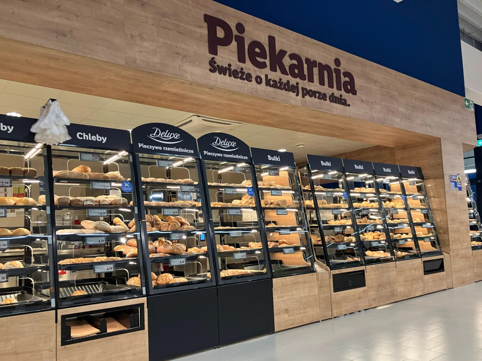 Prejšnjo leseno optiko v kategorijah ambientalnih in neživilskih izdelkov so nadomestili s premium antracitnim videzom. Les ostaja rezerviran za sadje in zelenjavo ter pekarno, saj ohranja toplino v svežih kategorijah in podpira pozitivno čustveno vzdušje na začetku nakupovalne poti. Navigacija po policah v pekarni se je iz barve bež spremenila v standardizirano antracitno, kar je izboljšalo vzdušje samega oddelka. Prejšnje delitve na oddelka: »cukiernia« (slaščičarna) in »piekarnia« (pekarna) ni več.