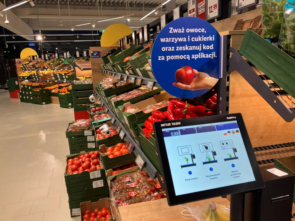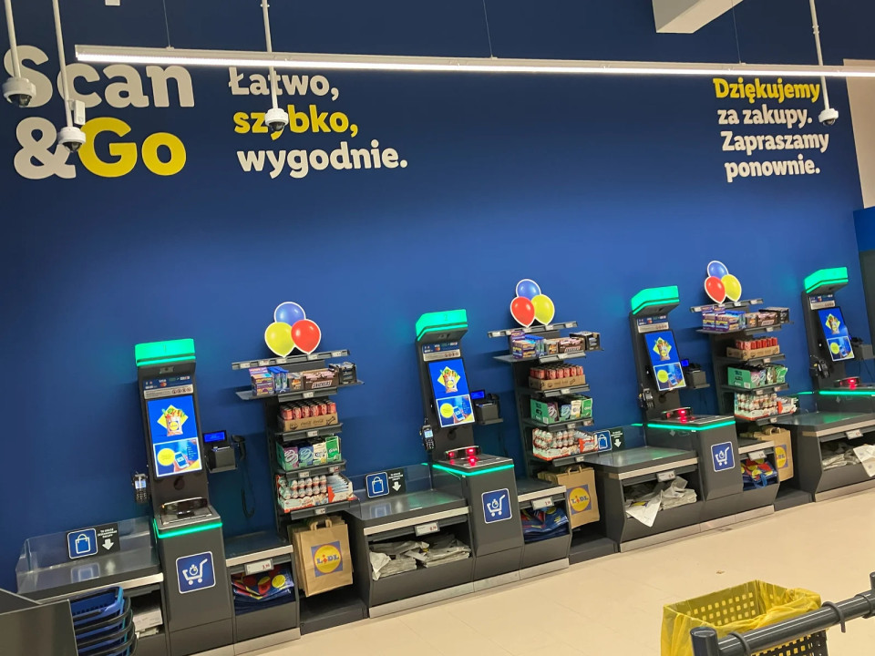 Območje samopostrežne blagajne vsebuje na novo zasnovane terminale z jasnim sporočilom_ »Skeniraj in pojdi«. Namesto lokalnih sporočil taka komunikacija zdaj poudarja udobje: »łatwo, szybko, szybko« (enostavno, hitro, udobno).