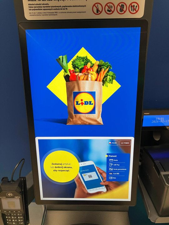 Novi samopostrežni blagajniški terminali imajo povečane zaslone nad plačilnim vmesnikom. Trenutno prikazujejo blagovno znamko Lidl, vendar lahko služijo kot začasni prostor za prihodnja sporočila POS.