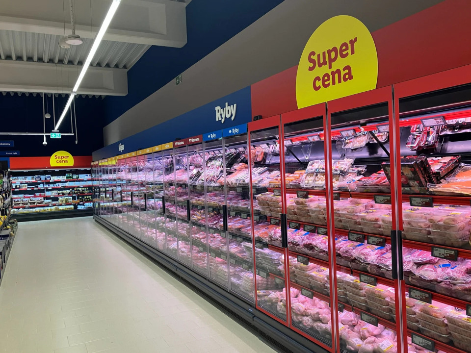 Meso, perutnina in ribe so v celoti integrirani v neprekinjeno hladilno linijo vzdolž stene. Rdeči okvirji vrat hladilnih vitrin in rdeča držala za cene povečujejo promocijo: »Super cena«.