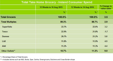 Irska spletna stran businesspost.ie poroča o tržnem deležu živilskih trgovcev na Irskem. Na zelenem otoku sta na prvem mestu Tesco in SuperValu, vse bolje pa gre tudi obema nemškima diskonterjema, Lidlu in Aldiju.