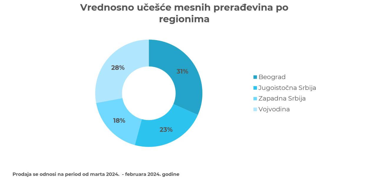 Kada posmatramo količinsku prodaju mesnih proizvoda prema regionima, podaci pokazuju da je u Vojvodini ostvareno 28,9% ukupne prodaje, u Beogradu 26,2%, u jugoistočnoj Srbiji 25,2%, dok je u zapadnoj Srbiji zabeleženo 19,7% ukupne količinske prodaje.