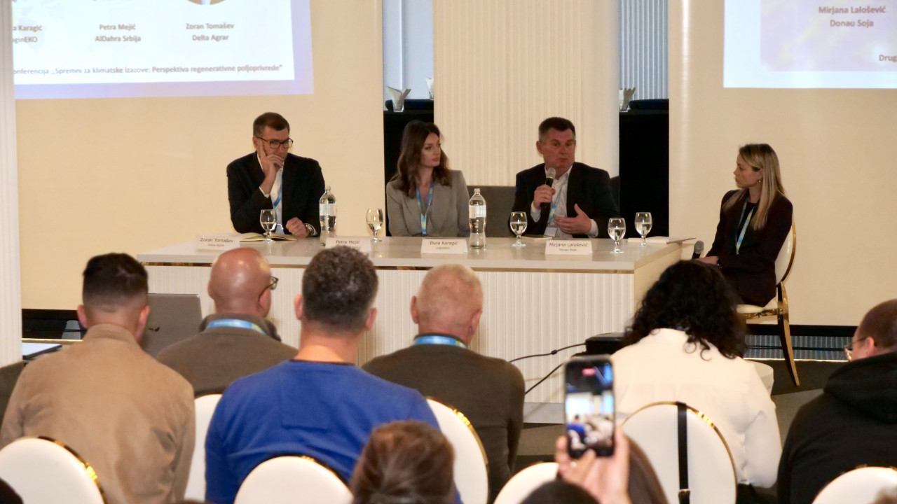 Panel diskusija "Regenerativni pristupi u ratarstvu i povrtarstvu: Od ideje do prakse" okupila je predstavnike velikih i inovativnih sistema: Petru Mejić (AlDahra, Srbija), Zorana Tomaševa (Delta Agrar) i dr Đuru Karagića (LoginEKO). Učesnici su saglasni da prelazak na regenerativnu poljoprivredu nije brz proces, ali da donosi dugoročne koristi – stabilnije prinose, bolju strukturu zemljišta i manju zavisnost od mineralnih đubriva i pesticida.