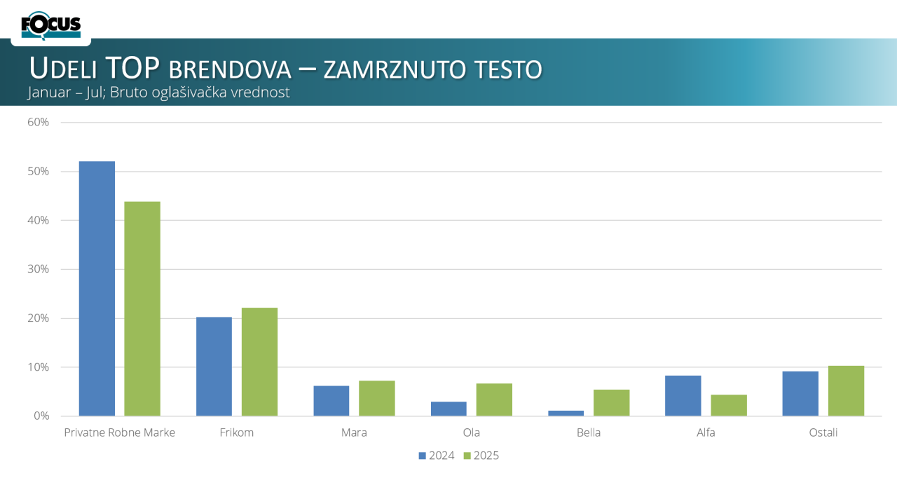 Drugi dijagram: Kategorija zamrznutog povrća solo sve više se konsoliduje oko vodeća tri brenda. Frikom ostaje dominantan i u prvih sedam meseci beleži rast sa 41,3% u 2024. na 45,1% u 2025. godini, dodatno učvršćujući lidersku poziciju. Privatne robne marke ukupno zadržavaju snažan udeo po bruto oglašivačkoj vrednosti, zadržavši se na drugom mestu uz blagi pad sa 35,1% na 34,8%. Rast ostvaruje i Friglo, koji povećava udeo sa 9% na 10,8% i time jača svoju poziciju na tržištu. Flora Food beleži pad sa 7,4% na 4,5%, dok ostali brendovi takođe gube, spuštajući se sa 7,2% na 4,8%. Ukupni trend jasno pokazuje jačanje ključnih igrača, naročito Frikoma i Frigla.