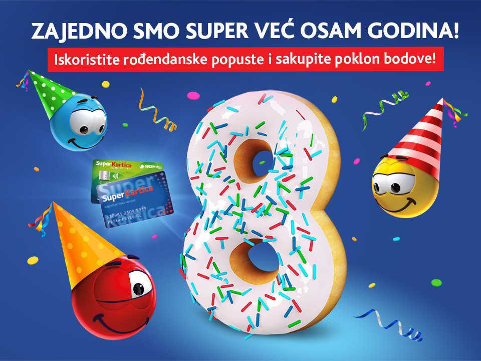 Super Kartica je danas saveznik i savetnik pri kupovini, zajedno sa 15 partnera i zato ne zaboravite, da tokom slavljeničke nedelje sa sobom u nabavku ponesete Super Karticu, Platnu Super Karticu ili mobilni uređaj sa instaliranom Super Kartica aplikacijom i na prodajnim mestima partnera iskoristite brojne rođendanske pogodnosti, navodi se u saopštenju kompanije.