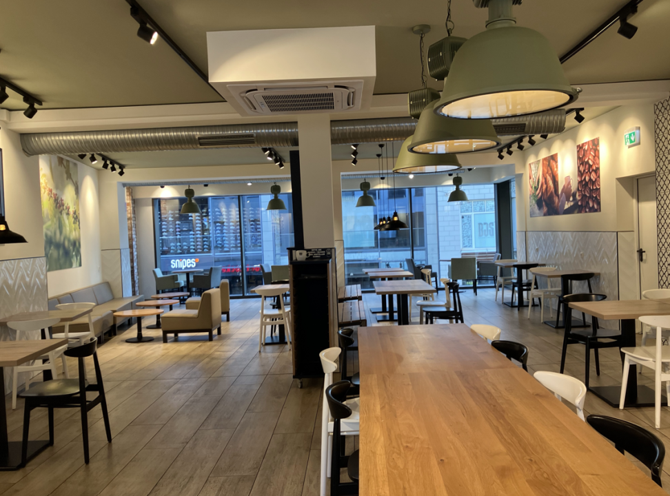 Številni aparati za kavo, nameščeni pri vhodu, omogočajo hitro postrežbo v jutranji prometni konici. Ponudba vključuje kavo za s seboj in skodelice za uživanje na kraju samem, kar omogoča jasno izbiro med možnostmi "za s seboj" ali "prigrizek v restavraciji".