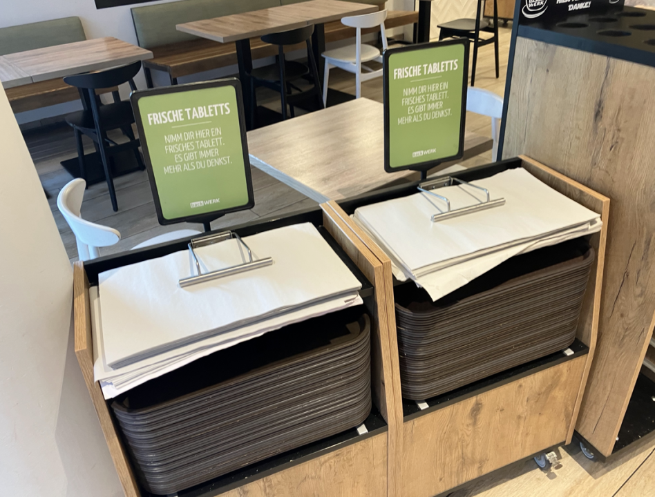 Samopostrežni pladnji so iz higienskih razlogov opremljeni s papirnatimi podstavki. Ta praktična podrobnost poudarja BackWerkov učinkovit in standardiziran koncept udobja.