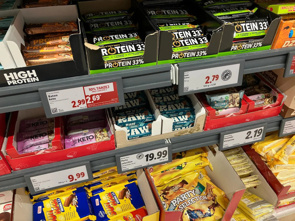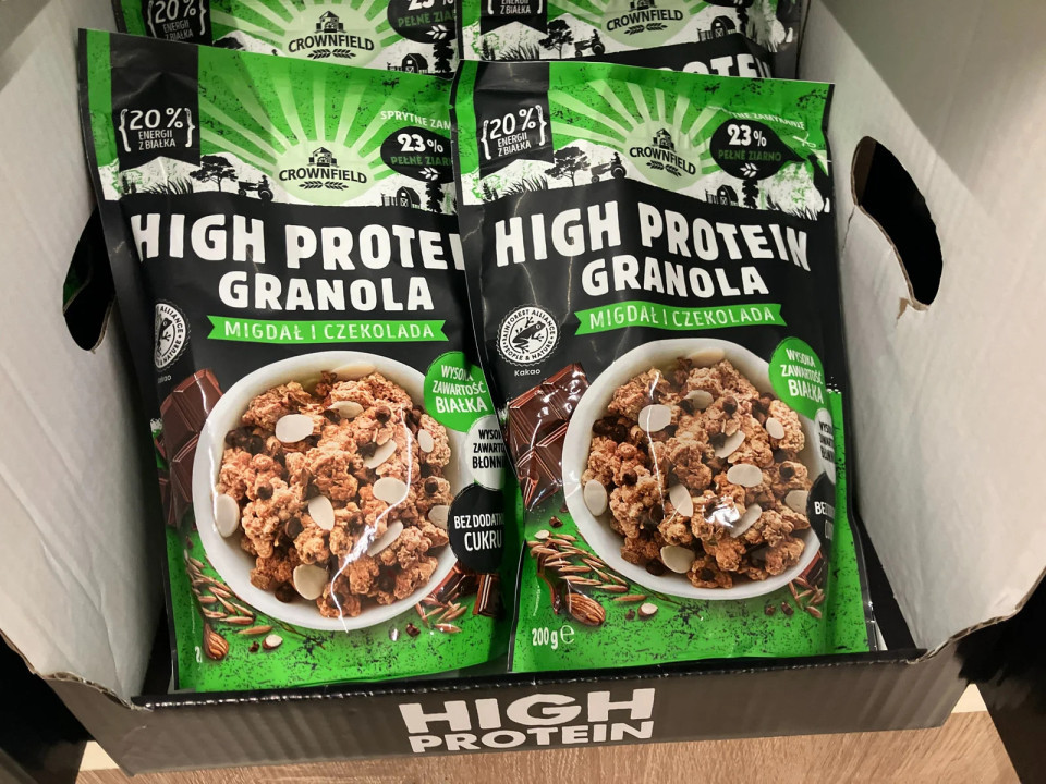Neposredno spodaj so na policenamestili müsli ploščice za prigrizke pod zasebno blagovno znamko Crownfield, ki širijo ponudbo zajtrkov "za s seboj" Čeprav je Crownfield tradicionalno Lidlova blagovna znamka za izdelke na osnovi žit, se zdaj pojavlja v različnih delih trgovine. V oddelku s sladkarijami je med ploščicami na osnovi žit in prigrizki povezanimi z zajtrkom v manjših pakiranjih (40 g), vključno s premium različicami. Poleg tega je granola z visoko vsebnostjo beljakovin razstavljena na posebni gondoli na koncu in je označena z "Bądź fit" ("Bodi fit"), kjer Lidl združuje svojo ponudbo izdelkov z visoko vsebnostjo beljakovin, ki jih hranijo pri sobni temperaturi.