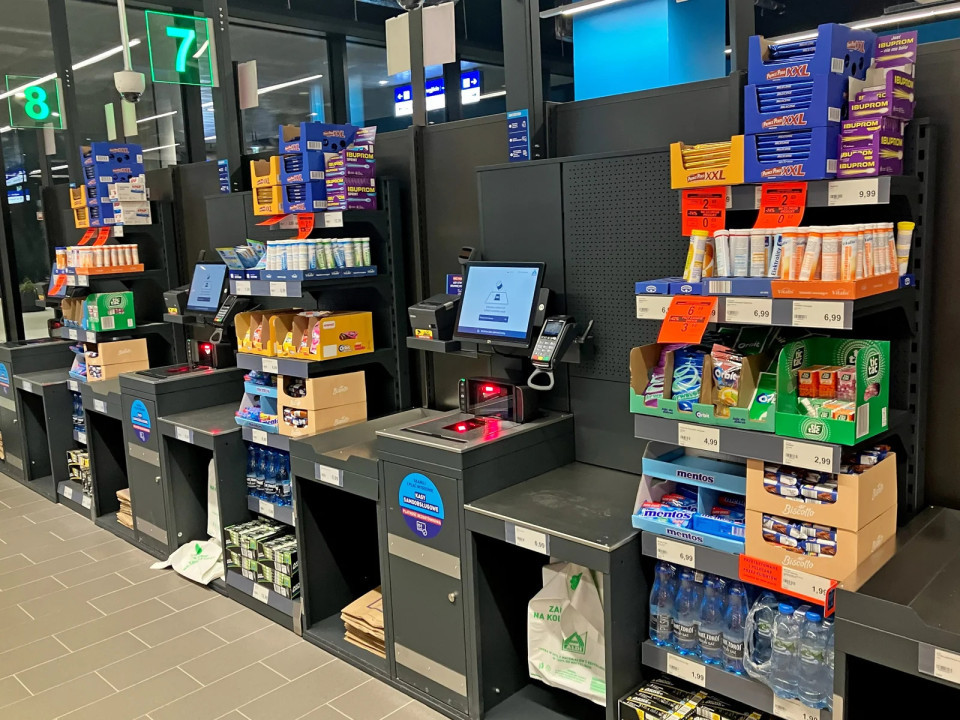 Šest samopostrežnih blagajn omogoča hitro nakupovanje, dve klasični pa delujeta v tandemu.