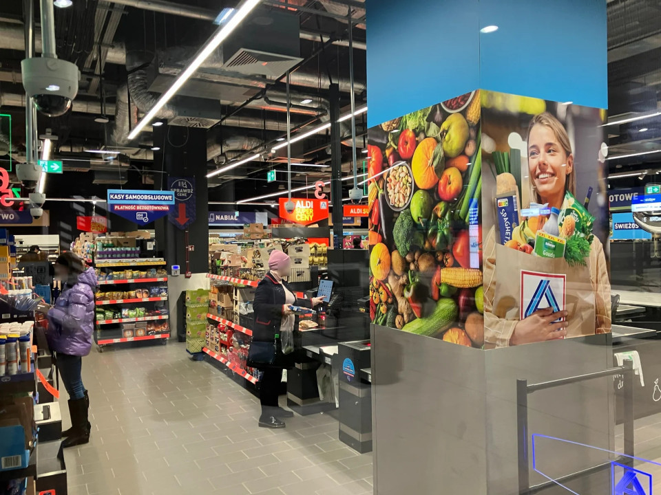 600 m² velika trgovina Aldi v formatu Compact 2.0 na postaji Warszawa Zachodnia se nahaja eno raven pod peronom, neposredno v coni gibanja potnikov.