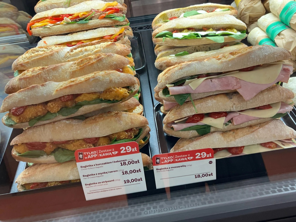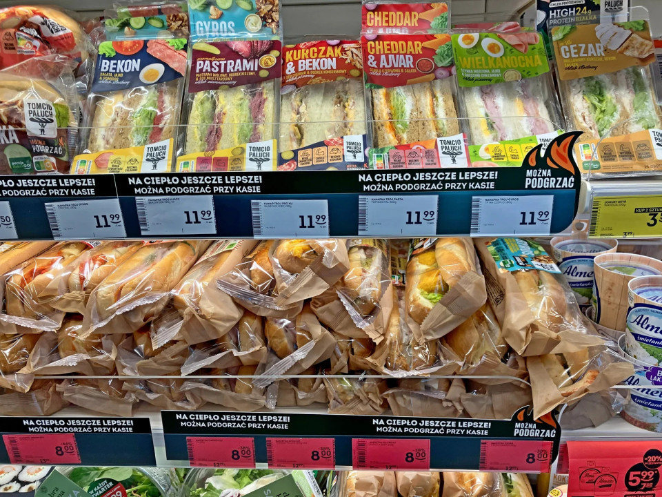 Sendviči v trgovinah Żabka poudarjajo hibridno vlogo med trgovino z živili in prostorom za hiter obrok, hkrati pa sporočajo možnost ponovnega pogrevanja izdelka.