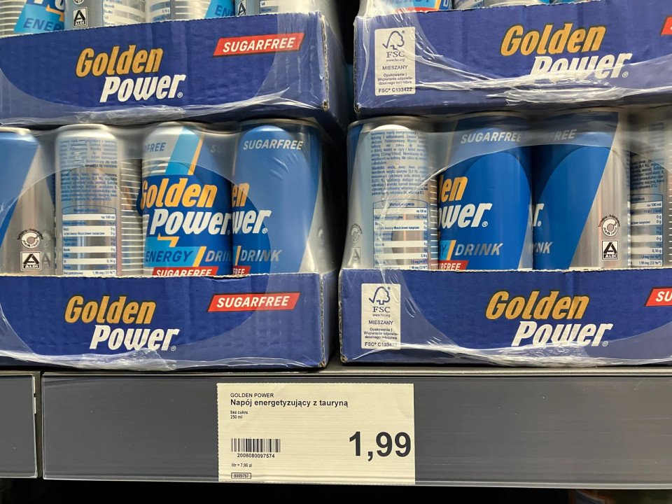 Aldi še dodatno znižuje raven cen z zasebno blagovno znamko Golden Power, s čimer se v tej kategoriji jasno pozicionira kot vodilni v ceni v primerjavi z Żabko in 1 Minute.