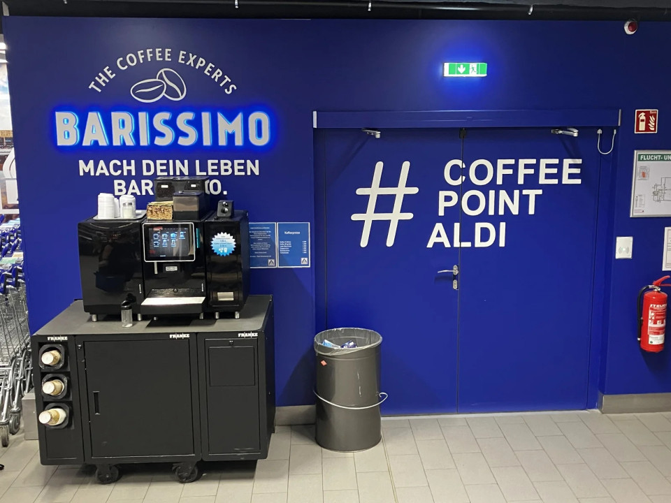 V Leipzigu Aldi v trgovinah na prometnih lokacijah integrira samopostrežni kavni avtomat pred blagajno kot del koncepta.