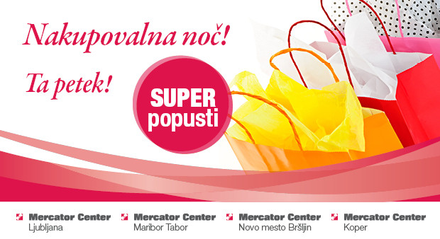 Jutri bo nakupovanje v štirih Mercator centrih nekaj posebnega. Pripravili so nakupovalno noč, s super popusti, izjemnimi ugodnostmi, z glasbenimi gosti in nagradno igro. Med 20. in 23. uro bo kupce v:Mercator Centru Ljubljana zabavala klapa Galešnik iz Hvara s Stiškim kvartetom, v Mercator Centru Maribor Tabor bodo lahko prisluhnili klapi Maslina, v Mercator Centru Koper bosta za žur poskrbeli skupina Malibu in Plesna šola Fiona, v Mercator Centru Novo mesto Bršljin pa bo nakupovanje bolj veselo z ansamblom Spev.