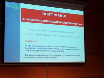 Predsednik GZS, mag. Samo Hribar Milič, je spregovoril o alarmantnih obremenitev, ki grozijo gospodarstvu. Rekel je, da "mamo dost", da se v razmerah, ko imamo negativno gospodarsko rast, ko ni delovnih mest, ko ni investicij, ni investitorjev, gospodarstvo parcialno, po posameznih področjih vedno znova dodatno obremenjuje. Kot primere je navedel, da že skoraj pol leta ni nič novega na področju znižanja prispevkov za OVE in trošarin na energente.