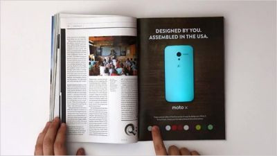 V januarski številki revije Wired so objavili oglas za Motoroline pametne telefone Moto X, ki so kupcem na voljo v različnih barvah. Revolucionarni oglas, na katerem je slika telefona se ob dotiku posamezne barve na barvni lestvici spreminja.
