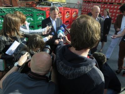 Na dvorišču, kjer je potekala improvizirana novinarska konferenca sta v ozadju sicer še plapolali zastavi P.Laško in Uniona (brez Heinekenove), a novinarjem so že delili sporočilo za medije z Heinekenovo glavo in naslovom: "Heineken bo pridobil večinski delež vodilne slovenske Pivovarne Laško d.d." in podpisanimi imeni novih predstavnikov za medije: Johna Clarka, Cristine van Waeren, Sonye Ghobrial in Gabriele Malczynske.