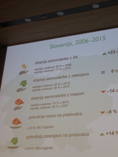 | Statistični urad (SU) RS je na Brdu pri Kranju organiziral statistični dan o hrani. Na Statističnem dnevu 2017 so priznani slovenski strokovnjaki razpravljali o hrani, o skrbi za prehransko varnost ter o podatkovnih osnovah, ki omogočajo vpogled v stanje na tem področju. Hrana je (tudi) v Sloveniji vedno prava tema, naša država pa je neto uvoznica hrane, saj se doma pridela manj kot polovica porabljene hrane. Del hrane namesto na krožnikih konča v smetnjakih. V 2015 smo v Sloveniji zavrgli 55.000 ton še užitne hrane. Prebivalec Slovenije je tako v 2015 zavrgel povprečno 27 kg še užitnega dela hrane, in ta hrana ne bi smela končati v smeteh. Urša Zgojznik (Društvo Ekologi brez meja) je izpostavila zastrašujoč svetovni podatek, da tretjina pridelane hrane konča v smeteh... Potreben je tudi razmislek o učinkovitosti obstoječih sistemov proizvodnje in porabe hrane, njihovi interakciji ter vplivih na kakovost življenja in stanje okolja. Med številnimi zanimivimi podatki govorcev, podkrepljenimi s številkami, smo lahko med drugim od Mateja Gregoriča iz Nacionalnega inštituta za zdravje izvedeli, da v zadnjem času v Sloveniji jemo premalo zelenjave, ki pa se po drugi strani za pridelovalce ne izplača tako kot se je včasih, saj je cena strahovito padla kot se je izrazil Branko Ravnik iz KGZS, ki je dejal tudi to, da bi naj bila ravno cena garancija za kmete in to za več generacij vnaprej, ne pa da cene odkupa niso znane do zadnjega trenutka in se stalno spreminjajo. Podobno velja tudi za ostala živila, kjer pa so vsi po vrsti poudarili predvsem pomen domače nakupovalne verige in da se tega moramo bolj(e) zavedati tudi kot potrošniki. O številnih vidikih potenciala kmetijstva in vprašanjih zagotavljanja hrane so razpravljali priznani strokovnjaki v okviru prve okrogle mize: "Učinkovita proizvodnja in gospodarna poraba hrane." Moderator okrogle mize je bil Luka Juvančič (Biotehniška fakulteta), razpravljalci pa so bili: Branko Ravnik (KGZS), Anka Lipušček Miklavčič (Mlekarne Planika, d.o.o. Kobarid), Urša Zgojznik (Društvo Ekologi brez meja), Matej Gregorič (NIJZ), Jože Verbič (KIS) in Tadeja Kvas Majer (MKGP). Tematiko podatkovnih osnov za spremljanje tega področja so osvetlili priznani strokovnjaki, ki pri svojem delovanju uporabljajo ali zagotavljajo različne podatke. Razpravo na drugi okrogli mizi, ki je potekala pod naslovom:"Obstoječi podatki in nove potrebe po podatkih na področju prehranske verige," je kot moderator vodil varuh prehranske verige v Sloveniji, Jože Podgoršek. Sodelovali so: Miroslav Rednak (KIS), Mateja Kovač (UMAR), Maja Prijatelj Videmšek (Delo), Renata Karba (UMANOTERA), Primož Marolt (IRSKO), in Barbara Kutin Slatnar (SURS).