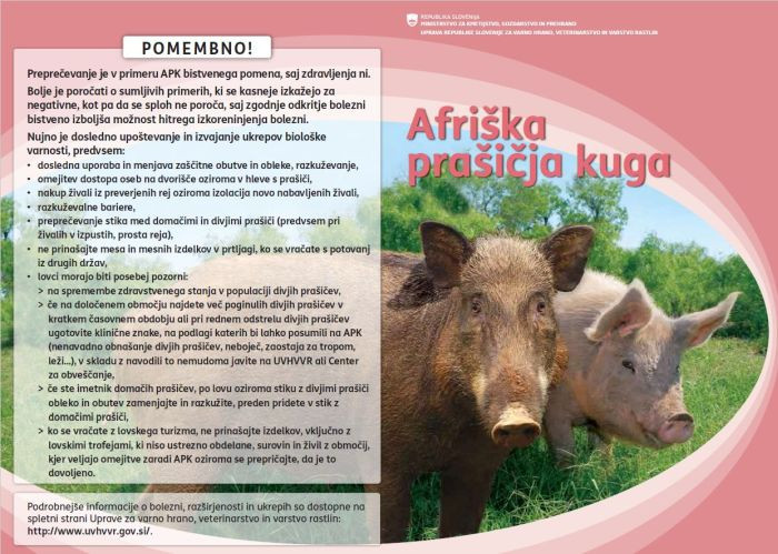 Uprava RS za varno hrano, veterinarstvo in varstvo rastlin (UVHVVR) je zato prašičerejcem posredovala letak z informacijami o bolezni ter o ukrepih za preprečevanje vnosa in širjenja bolezni.