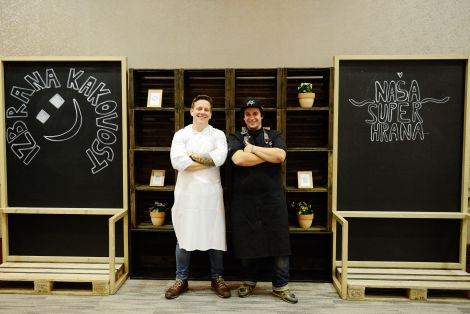 Ivo Tomšič in Jorg Zupan (nafotografiji zgoraj) sta pred očmi gostov, v živo, pripravila kreativne jedi, ki so temeljile na mesnih izdelkih, označenih z zaščitnim znakom "izbrana kakovost – Slovenija".