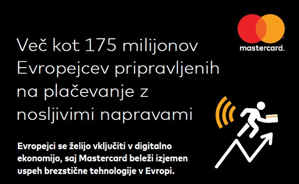 Četrtina (24 %) Evropejcev se po novih podatkih Mastercarda nadeja začetka uporabe brezstičnega plačevanja "tap and go" s pametno uro, zapestnico, obeskom za ključe ali drugimi nosljivimi napravami za plačevanje. Brezstično plačevanje s karticami Mastercard in Maestro se je lani povečalo za 145 %. Ob tem uspehu lahko vidimo, da so mnogi Evropejci pripravljeni raziskovati nove načine plačevanja.