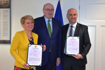 Evropski komisar za kmetijstvo in podeželje Phil Hogan (na fotografiji v sredini) je včeraj Sloveniji in Hrvaški predal certifikat skupne zaščite za Oljčno olje Istra. Certifikat je s strani Slovenije sprejela ministrica, Aleksandra Pivec.