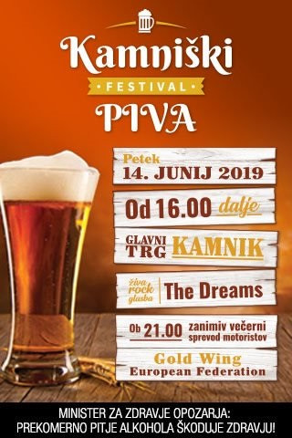 Zavod za turizem, šport in kulturo Kamnik vabi danes, 14. junija, od 16. ure dalje na Glavni trg na festival piva. Predstavile se bodo štiri kamniške pivovarne in številne druge mikropivovarne iz vse Slovenije. Poskrbljeno bo tudi za hrano. Dogajanje bo popestrila glasbena skupina The Dreams, ki bo igrala blues, jazz in rock.
