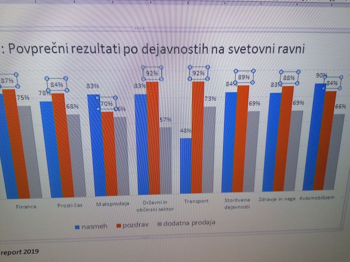 V primerjavi z letom 2018, je nasmeh enak, pozdrav je za 8 odstotnih točk slabši, dodatna prodaja pa se je izboljšala za 19 odstotnih točk na svetovni ravni.