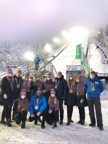 Na fotografiji Tomaž Šušteršič, predsednik OK Planica v ospredju z uradnimi hostesami