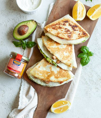 Dodatne sestavine: 1 čajna žlička masla 1 žlica oljčnega olja Postopek: 1. Prvo tortiljo zarežemo do polovice in nato vsako četrtino obložimo s pripravljenimi nadevi. Najprej zapognemo del s kislo smetano proti guacamolu, ki je nad njo. Nato pa vse skupaj prepognemo proti salsi in na koncu na zadnji del s tunino in mocarelo. Dobiti moramo trikotni sendvič. Postopek ponovimo s preostalima tortiljama. 2. V ponev dodamo čajno žličko masla in žlico oljčnega olja. Na nižji do srednji temperaturi počasi popečemo sendviče, da se segrejejo vsi sloji, tortilja postane zlato rjavo in sir stopi. Pripravljene sendviče takoj postrežemo in uživamo v eksploziji poletnih okusov.