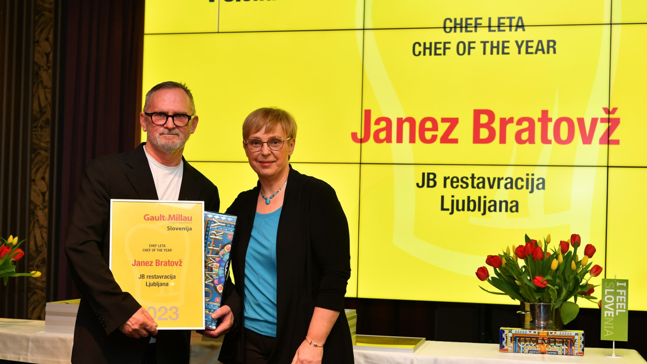 Šef leta 2023 je postal Janez Bratovž iz ljubljanske JB restavracije (na fotografiji mu nagrado predaja predsednica RS Nataša Pirc Musar), šef prihodnosti pa Rok Martinčič iz Gostilne Jež v Jagnjenici, so danes sporočili iz vodnika.