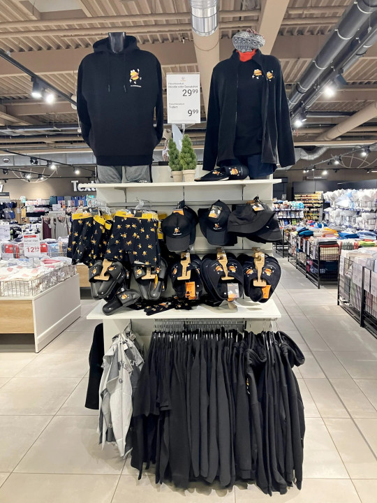 Unutar marketa, cijeli završetak gondole posvećen je liniji #Fleischkäsekult. Asortiman uključuje ležernu odjeću i dodatke poput dukserica, jakni, retro hlačica, kapa i kućnih papuča. Prezentacija je koherentna i jasno pozicionirana kao tematski merchandising, a ne kao jednokratna promotivna akcija.