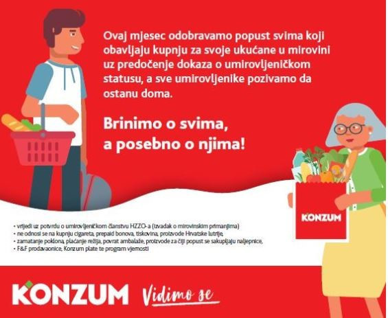 „U vrijeme epidemije koronavirusa posebno je važno zaštititi naše starije sugrađane te ih potaknuti da ostanu doma i što manje izlaze. S druge strane, znamo koliko našim kupcima u mirovini znači popust od 10 posto na ukupnu kupnju na koji mogu računati svaki mjesec. Stoga smo pod sloganom 'Brinimo o svima, a posebno o njima' ovaj mjesec odlučili omogućiti ne samo umirovljenicima, nego i njihovim najbližima da im pomognu u nabavci i ostvare popust koji će im dobro doći za njihov kućni budžet. Sad je najvažnije brinuti o zdravlju i dobrobiti svih nas te posebno čuvati naše starije koji su među najugroženijima“, izjavila je Dunja Delić, direktorica Sektora marketinga Konzuma.
