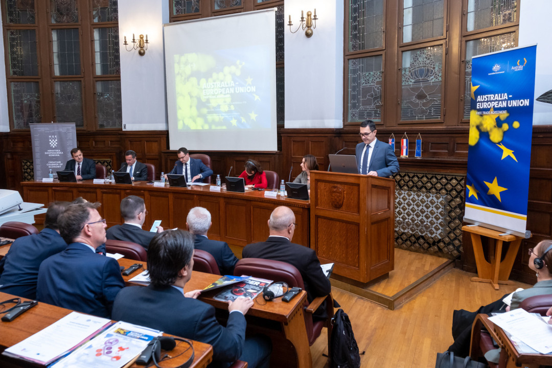 „Robna razmjena EU i Australije vrti se oko iznosa od 55 milijardi dolara godišnje. EU je drugi najveći trgovinski partner Australiji i drugo najveće izvozno tržište usluga. Unija je prošle godine bila i najveći izvor stranih ulaganja u Australiju. U kolaču od spomenutih 55 milijardi Hrvatska ima udio od tek 23,8 milijuna dolara. To je brojka kojom nikako ne možemo biti zadovoljni iako većina otpada na naš izvoz u Australiju (21,5 milijuna dolara). Zato Sporazum o slobodnoj trgovini između EU i Australije vidimo kao dodatni poticaj i našim bilateralnim odnosima“, istaknuo je potpredsjednik Hrvatske gospodarske komore za industriju i energetiku Tomislav Radoš na poslovnoj tribini Australija-EU: Sporazum o slobodnoj trgovini i njegov značaj za EU i Hrvatsku.